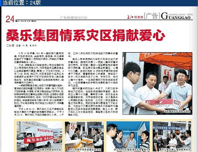 長(zhǎng)江信息報(bào):桑樂(lè)集團(tuán)情系災(zāi)區(qū)捐獻(xiàn)愛(ài)心