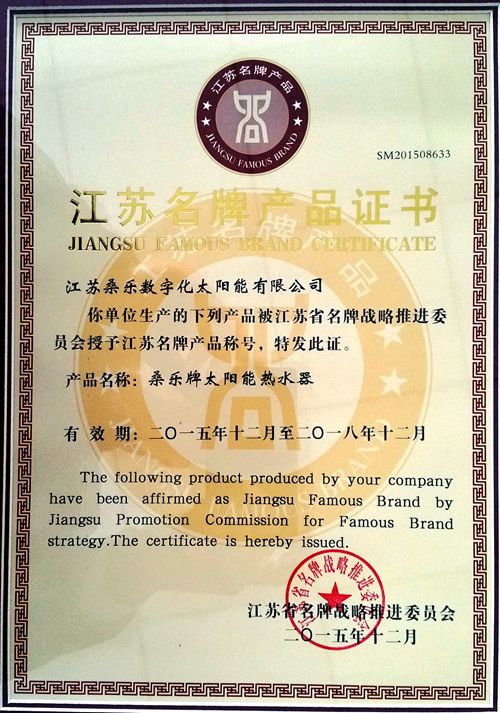 江蘇名牌是江蘇省委、省政府為促進(jìn)經(jīng)濟(jì)發(fā)展的戰(zhàn)略部署,對(duì)參選企業(yè)的質(zhì)量管理、產(chǎn)品服務(wù)、市場(chǎng)占有率等方面進(jìn)行嚴(yán)格審查。作為全國(guó)領(lǐng)先的太陽(yáng)能熱水器生產(chǎn)企業(yè),公司秉承產(chǎn)品質(zhì)量就是產(chǎn)品生命的理念,建立實(shí)施了嚴(yán)格健全的質(zhì)量管理體系,用優(yōu)質(zhì)的產(chǎn)品質(zhì)量為創(chuàng)建名牌產(chǎn)品夯實(shí)了基礎(chǔ)。